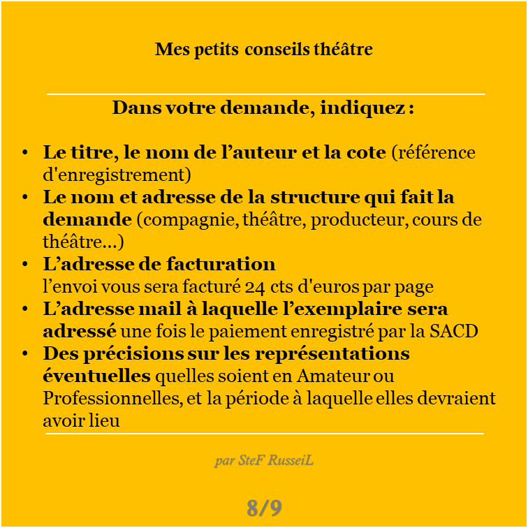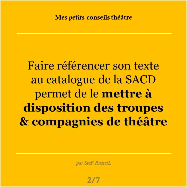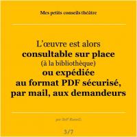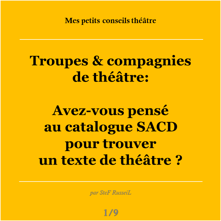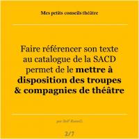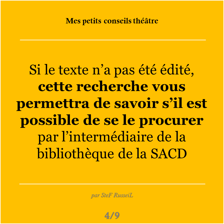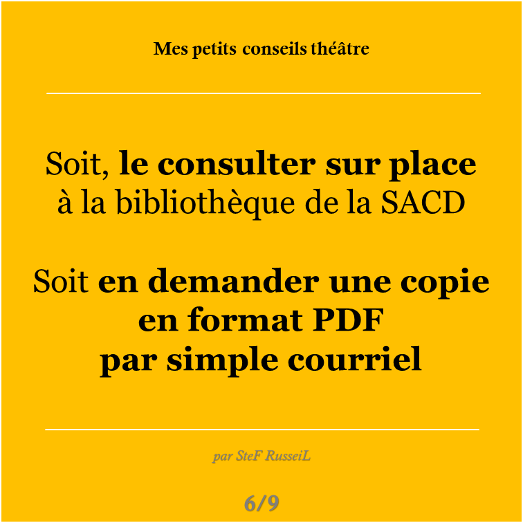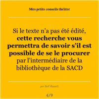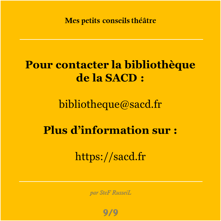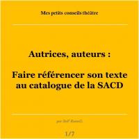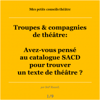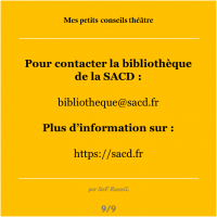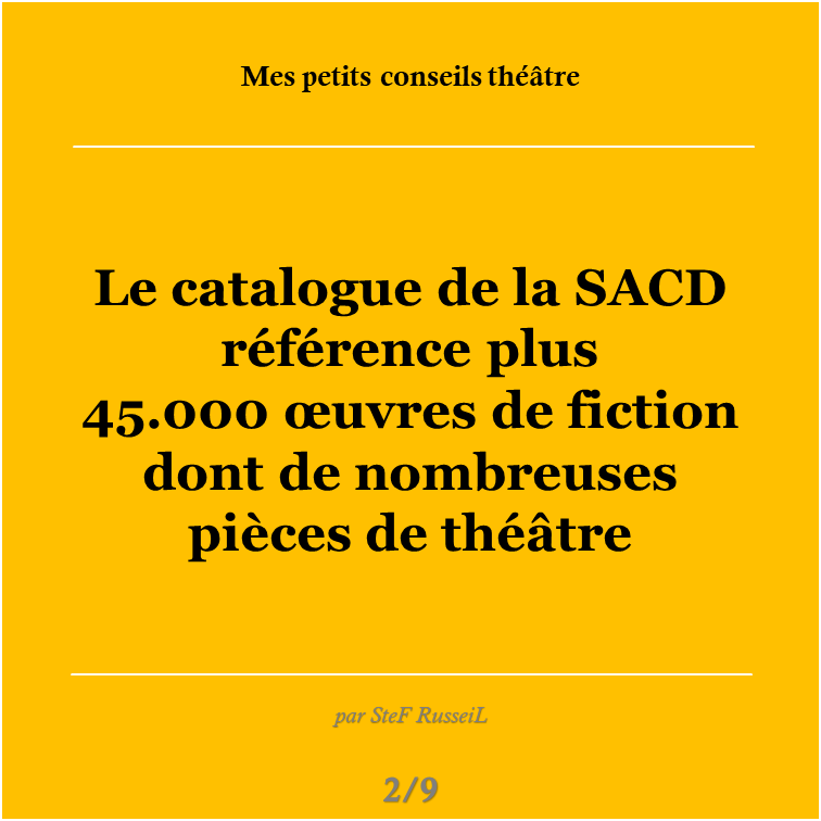 Mais il existe aussi une bibliothèque qui recense un très grand nombre d'œuvres théâtrales, c'est celle de la SACD (La Société des Auteurs et Compositeurs Dramatiques) et de son catalogue.