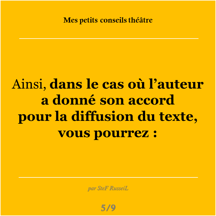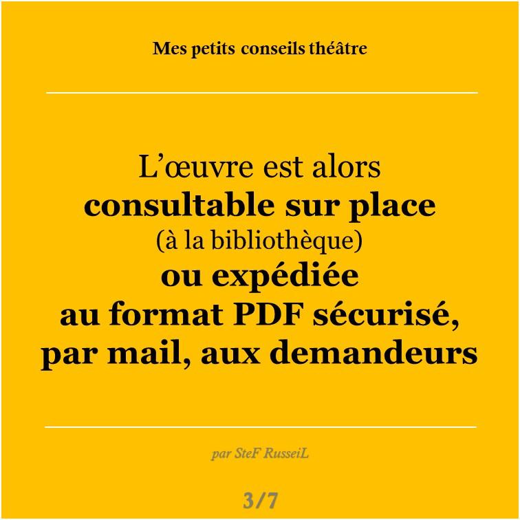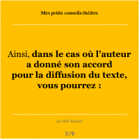 Il existe bien évidemment une multitude de possibilités pour diffuser et se procurer un texte : auprès de maisons comme La librairie théâtrale pour ne citer que la plus connue, via les sites de téléchargement tels que le Proscenium ou la Théâtrothèque, ou par l'intermédiaire des sites personnels des auteurs pour ceux qui en possèdent un.