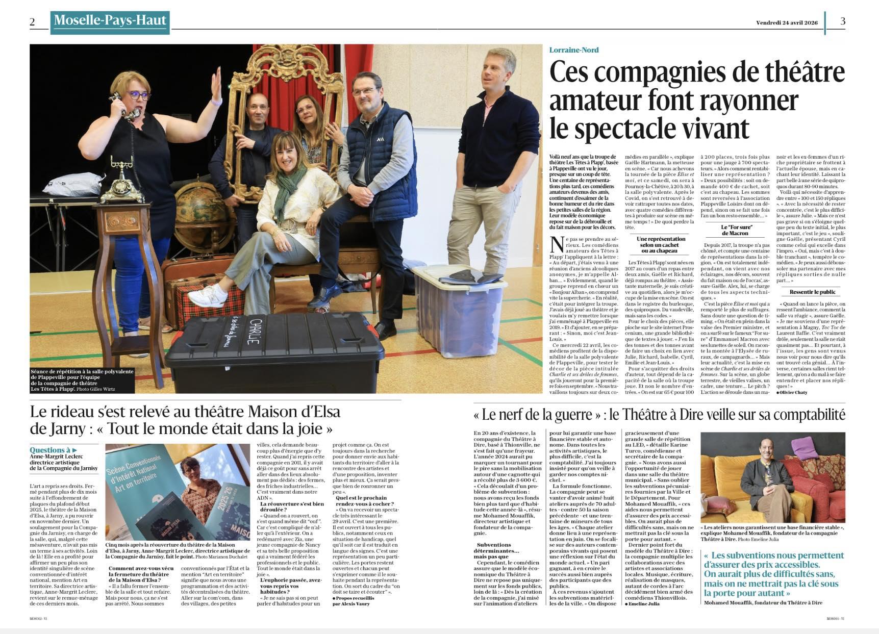 "Ce mercredi 22 avril, les comédiens profitent de la disponibilité de la salle polyvalente de Plappeville, pour tester le décor de la pièce intitulée Charlie et ses drôles de femmes, qu’ils joueront pour la première fois en septembre."